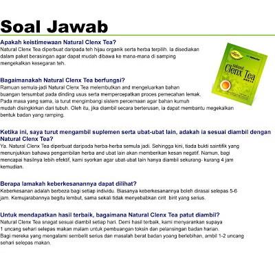 Saya mengambil Natural Clenx Tea bukan sebab nak kurus sebab saya memang dah kecik. Lagi satu untuk detox tea aku suka Clenx Tea sebab memang puas hati time membuang tu. Anak saf 3 orang.